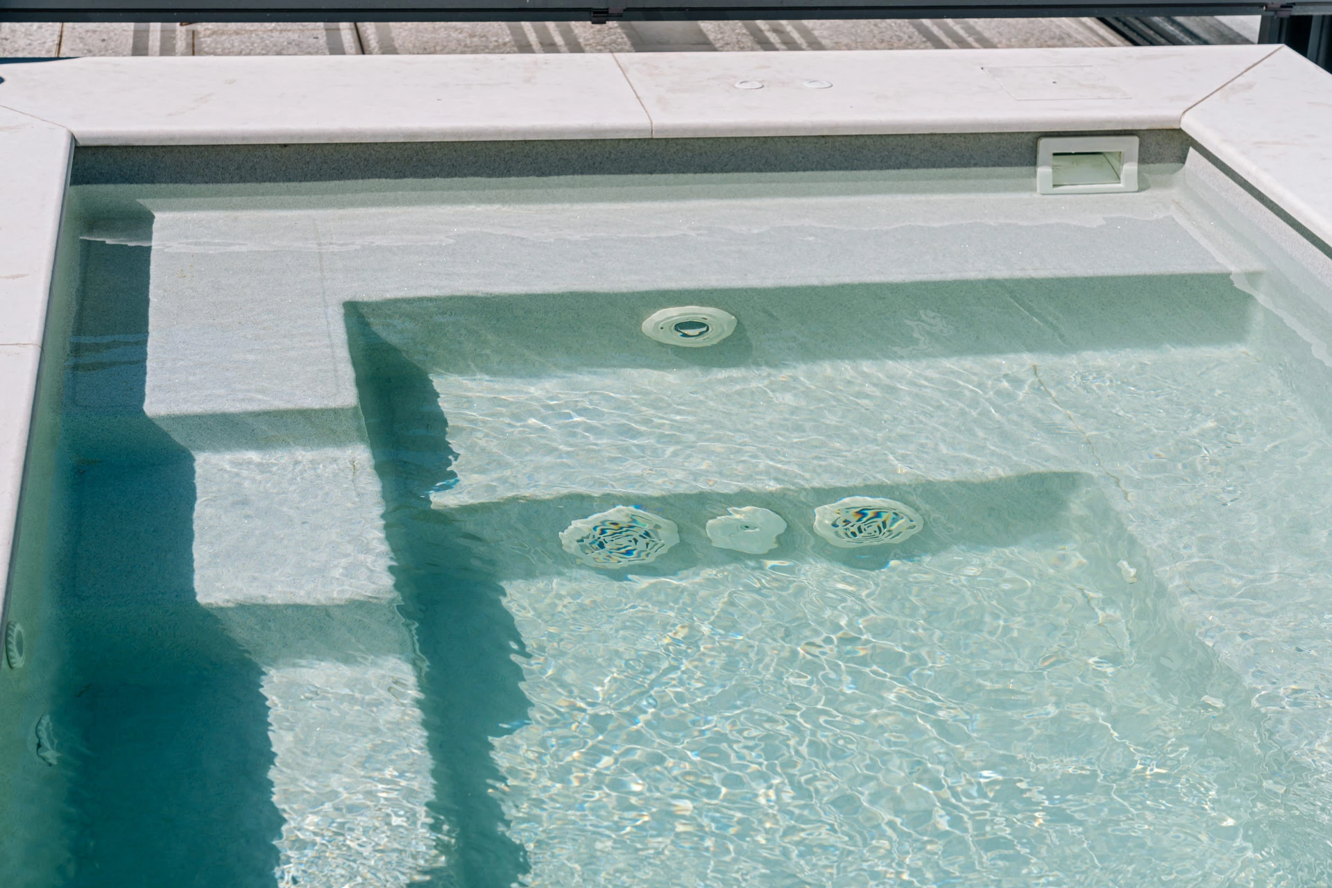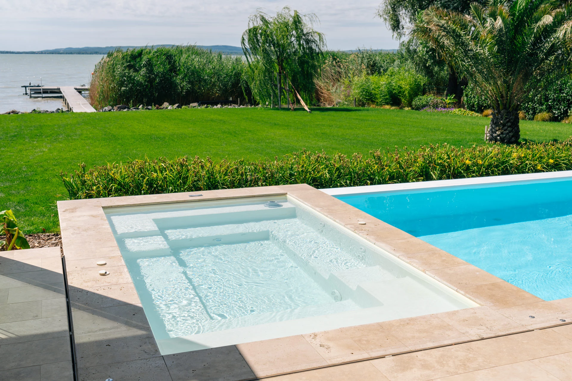 Thalia je najmanjši bazen podjetja AQUACOMET, ki lahko izpolni vaše sanje: vgrajen bazen, ki vsebuje tudi tehnično opremo za masažni bazen.